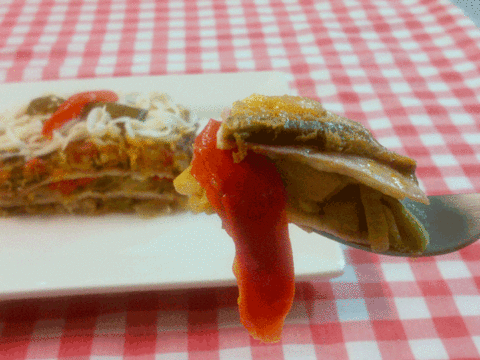 Esta lasaña es algo especial. Sustituimos las láminas de pasta fresca por láminas de berenjeta frita, ademas de añadir cebolla pochada, pimentos, jamón cocido, queso edam, pisto y mozzarella. No te quepa duda que no te dejará indiferente