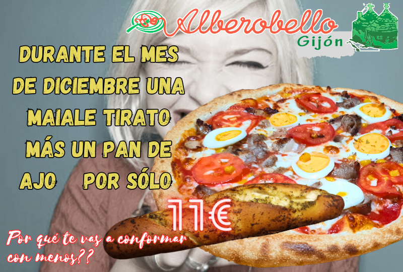 Ya tenemos nuevo mes encima, y diciembre nada menos!!! en esta ocasión nuestra oferta trae a nuestra última incorporación. La maiale tirato!!! una pizza elaborada con cerdo desmigado, tomate natural, huevo cocido, maiz y mozzarella. Una delicia que tienes que probar si o si, y este mes te la mando con un pan de ajo por sólo 11€!! por qué te vas a conformar con menos?? |