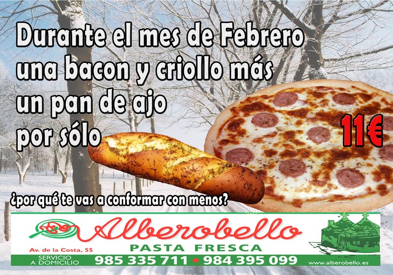 | Llega febrero con todo el frío que no vino hasta ahora. Pero en alberobello también tenemos solución para eso, nuestra nueva promoción nos trae una pizza grande bacon y criollo más un pan de ajo por sólo 11€. Una de nuestras pizzas más queridas a un precio que no puedes dejar pasar. Por qué te vas a conformar con menos?? |